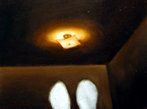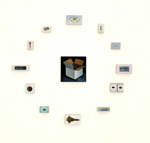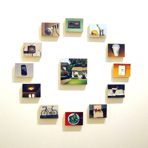 It's A Small World After All は、エリザベスのデスクやポケットに入っているような細々としたものが描かれています。最近引っ越しをした際に、あまりにも小さくて忘れられがちなこういう物にもそれぞれ重要な用途があることに気付いたそうです。私もよく鍵や定期券を「ない、ない、ない、、、」と探しますが、必要な時に見つからないとパニックになるという、そういう彼女の生活で貴重なものとして、小さい画面に宝石のように大切に描いてあります。全体では抽象的な作品にも見えて、私は彼女のちょっと違う作品として気に入ってます。