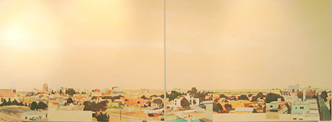 今回は1/4で紹介した作品の全体像。分断の部分、縦に入った風景の切れ目がいくつかあるのがわかるでしょうか(作品をクリックすると大きく見えます)。実際に街を見下ろせるようなポイントからスナップを撮り、その写真を切って、テープでコラージュして構成を練る。そんな写真の切り張りがアントニオのスタジオにはいくつかある。制作途中の作品では、キャンバスに直接貼ってあったり。街から街へというのが分断を強調しているならば、彼の作品の特徴的な広大な空は継続を主張しているようである。といっても街と街の境界がはっきり見える所もあれば、不思議とつながって見える所もあるのだ。