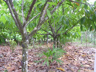 混植の利点はいろいろある。例えばある木につく害虫Aが隣に植えた果物の害虫Bの天敵ということになれば、害虫Bは淘汰され、木の方がだめになっても隣の果物は生き残れる。あるいは、短期間で育つ木を植え、その木陰に日なたを嫌うカカオなどを植えるとうまく育つとか、バナナの木の隣にカカオを植えると他の場所よりずっと元気に育つとかいった相乗効果があるそうだ。また木が生えていることで、枯葉が腐葉土となって土地を豊かにし、作物の成長を助けてくれる。