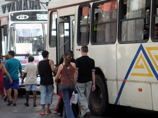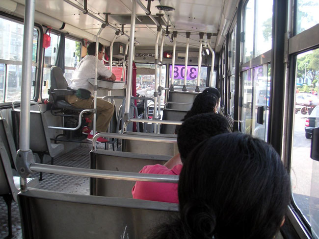 車内には車掌さんがいる。運転席の後ろに車掌席があって、乗客はここで料金を払い、回転扉を押して奥に進む。この扉にはカウンターがついていて通った人数を記録し、最終的にその数と集金額が一致するかどうかを確認するようだ。バス代は一律R$1.15(約46円)で、停留所1つ分でも2時間くらいの中距離でも同じ値段。そしてお年寄り、妊婦、身体の不自由な人、子どもなどは無料。車掌さんはいたってラフな勤務態度で、お客が少ないとつっぷして眠ってたり、新聞を読んでたり、化粧を直してたり、たまたま乗ってきた知り合いと話し込んでたりする。でもま、質問もできるし、乗客は何かと助かっているようだ。
