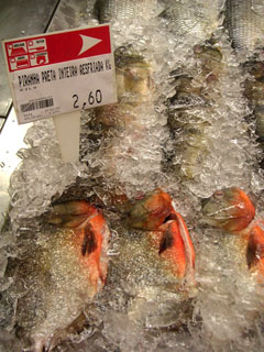 魚売り場に平然と並んでいるピラニア(1kg≒100円)。