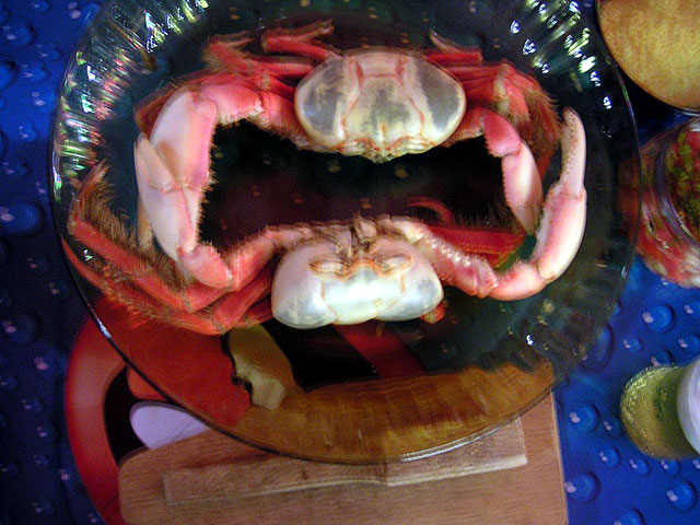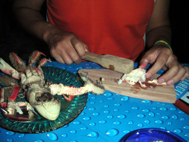 トキトキという料理は、丸ごと茹でたカランゲージョをまな板みたいな小さな板に載せ、木の棒で殻を叩き割って食べるというもの。この叩く音をこっちの人は「トキトキ」と表現する。でもどちらかというと「ガンガン」という感じで、野性的な気分になって味わえるものだ。