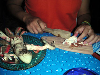 カニを木槌でトキトキしているところ。
