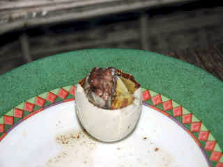 一言でいうとえぐい食べ物である。すでに中身と殻の間にすきまがあり、そこにたまっている液体をまずすする。白身の上には血管が走っている。かたくなりかけた餅のような食感の白身の中には、ヒヨコになるべき肉塊が収まっている。