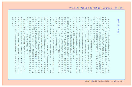 考えてみれば、この世の中で生きて行くというのは、なにもかも難しいことばかりであって、自分自身の体や住まいのはかなさや頼りのなさも、すでに述べた、地震や火事などに直面した街のようすと同じようなものかもしれない。ましてや、住む場所によって、また自分自身の境遇によって生じる、心の悩みの数々は、いちいち数え上げたらきりがない。(本文テキストへつづく・・・)
