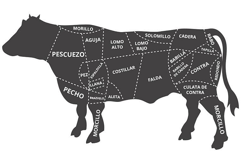 『ガリンド精肉店』は3人の共同経営だった。ガラスのショーケースの後ろで個人客をアテンドするのはぺぺ(またぺぺが登場するのだが、彼は小男のアンダルシア人)で、彼の下に2人のアユダンテ(ayudante;助手の店員)がおり、奥の方はもっぱらレストラン、カフェテリア、バルの顧客相手はアルツーロで、彼が半身の牛、豚の骨を外し、フィレーテ(Filete;テンダ-ロイン)、ソロミージョ(Solomillo;ヒレ肉)、エントレコット(Entrecot;リブロ-ス)、バビージャ(Babilla;ランプ)、レロンド(Redondo;モモ)などに腑分けし、クズ肉は挽いて腸詰にしたり、流行り始めていたハンバーガー用にしていた。