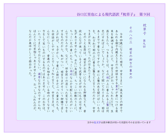 今年四歳になられた姫宮、中宮さまと一条天皇との御子であられる脩子(ゆうこ)内親王さまのお世話をする童女(わらわべ)が身につける装束を新調するようにと、中宮さまがおっしゃられたとき、生昌ときたら、つきましては、その衵(あこめ)の上に着られる上襲(うわおそい)は何色にすればよいでしょうか、などと聞いておりました。(本文テキストへつづく・・・)