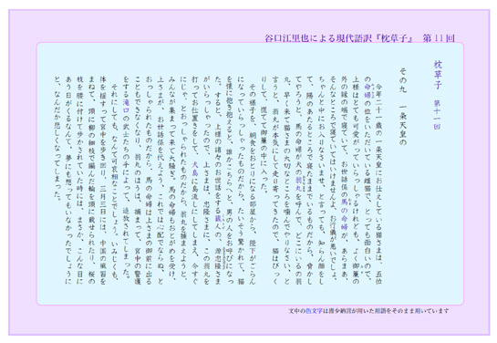 今年二十一歳の一条天皇にお仕えしている猫さまは、五位の命婦(みょうぶ)の位をいただいている雌猫で、とっても面白いので、上様はとても可愛がっていらっしゃるけれども、よく御簾(みす)の外の縁の端で寝ていて、お世話係の馬(むま)の命婦が、あらまあ、そんなところで寝ていてはいけませんよ…(本文テキストへつづく・・・)