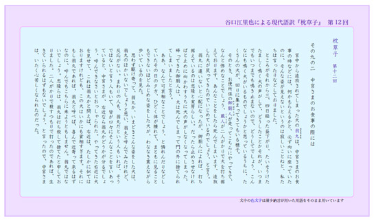 宮中から追放されてしまった犬の翁丸(おきなまる)は、中宮さまのお食事の時などには、何かもらえるかと、必ず向いに座っていたのに、そんな姿が見えないというのは寂しいことねと、私たちは言ったりなどしておりました。(本文テキストへつづく・・・)