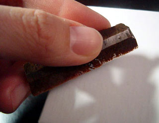 この授業はペーパーがメインで、先週最初のペーパーを提出すると早速つぎなる課題が配られた。最初の課題は、石器を「型式(かたち)から分類、分析する派」と「表面に残る痕跡から機能を分析する派」の論争について。そして第2弾は、「君もはじめにんげんギャートルズ!」(カッパ語訳)。つまり石器を配られて、実際にその石器を使って、どんな素材にどのように用いると、この鋭い刃にどんな形跡が残るかをレポートするんじゃ。皆にオブシディアン(黒曜石)とチャート(石英岩)で出来た小さい石器が二つ配られた。