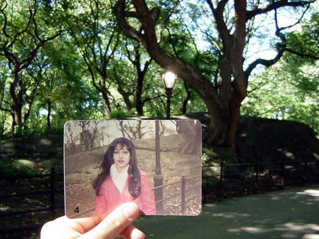 「この写真はフリーマーケットでみつけたの。ほらここでしょ。ここで撮影されたのよ。岩も街灯も同じ位置にある。」
