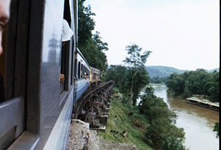 この地には今でもこの鉄道に関わる重労働と戦争時の傷跡を紹介する博物館が建っているのだが、もちろん鉄道自身も今でも残されていて、その線路の上を走る汽車に乗ってみることができるようになっていた。この列車の最大の見所はなんと言っても泰緬鉄道建設時最大の難関であったとされるアルヒル浅道橋だろう。クワイ川に迫り出すように聳える崖の脇を、木を組んで作った浅道橋が続く場所である。