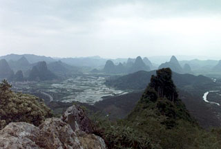結局、山の麓から頂上まで他の登山者には誰も出会わなかったが、この月亮山のてっぺんから眺める景色は、この桂林近辺でも最高の眺めであった。吹きさらしになった頂上は、むき出しの岩がゴツゴツとあるだけの小さなスペースで、思いのほか強い横風に何かに捕まっておかないと突風に吹き飛ばされそうなほどであったが、この景色を眺めるためであればそんな恐怖感も吹っ飛ぶというものである。