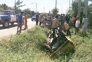 タイの道路事情というのは、ベトナムほどではないにしろそれなりに無秩序で、信号無視はもちろんのこと、運転ルールという概念すらないようなドライブをするドライバーたちが路上には溢れている。もちろん自分だってタイの運転免許すらない状態でバイクを貸りてきたのだから、タイ式の交通ルールなど知る由もない。そういうわけだから、これまでにも交通事故の現場は数多く目にしてきたし、このドライブの間にも道路脇の水田に見事にひっくり返った車の事故を目撃した。