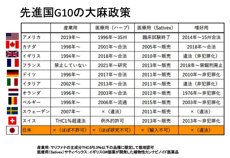 ■最近、驚いていることに大麻=マリファナ=カンナビスに関する各国の対応が恐ろしく変化していることだ。日本では未だに麻薬扱い?ではあるが、特に欧米諸国では医療用大麻だけでなく嗜好用大麻が解禁されており、少なくとも医療用大麻に関して違法な国はもはや少数となっていることだ。いつの間にか大麻=カンナビスの医療効果が世界的に浸透し、誰も否定できないほどの実績が出来てしまったようだ。G10の中でも医療用大麻の販売や輸入が承認されていないのは日本だけになってしまっている。
