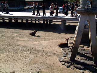 "厳島八景の一 鏡の池" など、干潮でなければ見られないものがある。鹿たちも水底の境内に入り込んで昼寝し、これはこれで楽しい眺めだ。ただし、物見遊山の客ばかりではなく、神社の奥でお払いを受ける人もいる。うしろ姿と手荷物から察するに、老夫婦と若い娘さんである。何を祈願し、どんな厄災から逃れようというのだろう。その風景はやはり厳粛そのものであった。