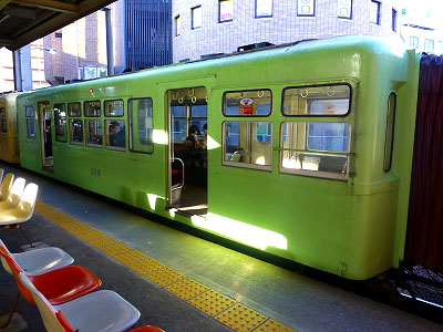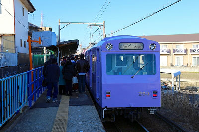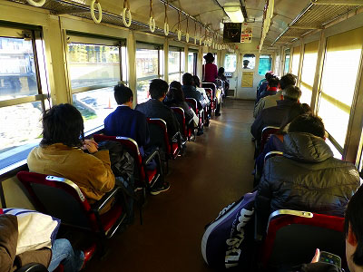 ホームは薄暗いけれど、電車はパステルカラーで、イエロー、グリーン、ピンクの順に並んでいる。遊園地のようで楽しげである。車内も高校生ばかりで、さぞ賑やかだろうと思っていたら、どんよりと重い雰囲気であった。学生さんは誰もが参考書やノートを開き、下を向いていた。期末試験の時期であった。大人は携帯電話に注目している。廃止対象の路線だけど、こんなに混んでいるぞ、という写真を撮ってみた。誰もが下を向いている。モザイクやぼかしは不要。記事で使っても苦情が来ないだろう。