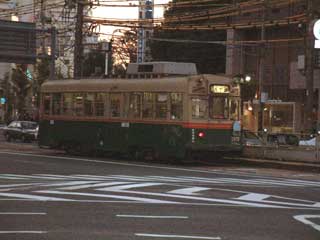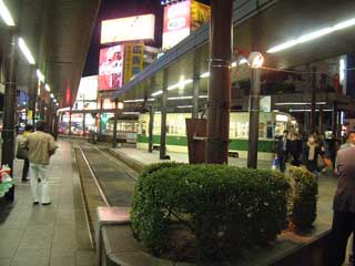 広島港への道は広いけれど、繁華街ではないせいか静かで暗い。片側1車線の道路に似合う沿道の景色だが、中央に電車の車線がふたつあるから、路面電車の無い街と比べると、建物と道幅のバランスが異なるのだ。街路そのものがゆったりしている。道の両側の商店は庇が連なり、青白い蛍光灯が灯っている。その灯りに照らされながら、路面電車は道の中央寄りを快走する。
