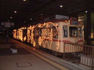 待つ間、停車中の電車をしばらく眺める。長いホームが3本あり、広島駅よりも立派な構えだ。路面電車の駅の格でいうと、港が表玄関で、鉄道の広島駅は勝手口なのかもしれない。そんなことを思っていると、停泊中の電車のひとつに灯りがついた。灯りだけではなく、車体の全体にめぐらされたモールにも豆電球がついて、遊園地のパレードカーのようになった。車体に線が張り巡らされた妙な車両があるな、と思っていたら、光の装飾電車というわけだ。