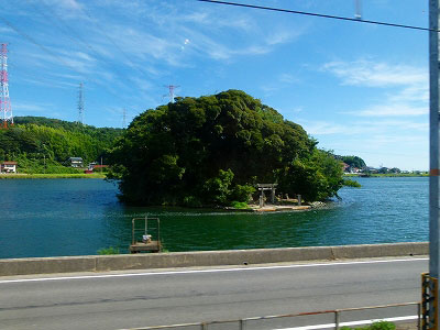中海が遠ざかり大橋川に出会うと、車窓に小さな島が現れた。小さな鳥居があって、手間天神社というそうだ。祭神は少彦名命(スクナビコナ)、大国主命の国造りを手伝い、酒造を広めた神様だ。それはともかく、あそこにお参りするには船で行くしかないようだ。泳いで渡る行事でもあるのだろうか。船が暮らしに根付いた地域ならではの神社だ。