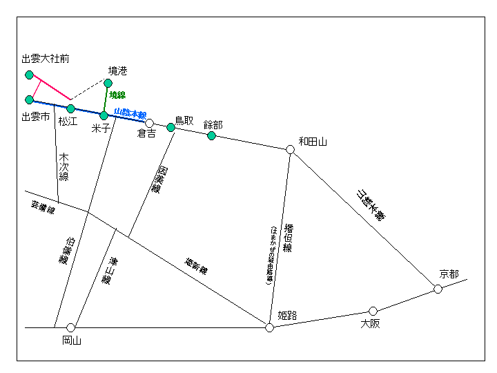 ただ、私にとって旅の動機は"未乗路線"である。山陰は未踏の地であり、出雲市まで行けば倉吉-出雲市間114.5キロを踏破できる。しかし、せっかく出雲市へ行くなら出雲大社へ向かう一畑電鉄に乗りたい。内陸へ向かうローカル線もあるし、米子から海へ境線が出ている。乗らずに通過するわけにはいかない。そこで私は、