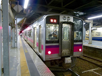 奥羽本線に乗り換えた。電車は701系で座席はロングシート。進行方向左側に座る。北上線と同様に真っ暗で何も見えない。しかし、大曲から秋田への道筋にはささやかな"お楽しみ"がある。秋田新幹線乗り入れ用に整備された区間だからだ。在来線列車用の狭軌と、新幹線用の標準軌が並ぶ。