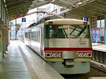 これから乗る列車は宇奈月温泉行きの急行電車である。電鉄富山駅発07時07分。ホームにはまだ入っていなかった。緑と黄色の各駅停車が2本いて、1本は本線の上市どまり。もう1本は上滝線経由の岩峅寺行き。この2本が2分の間を置いて次々に出発した。次は7分後、本線・立山線経由の岩峅寺行きである。地方私鉄とはいえ、なかなかの頻度である。列車の運行頻度に地域の力を感じる。富山港線から富山ライトレールになって、沿線は活気づいただろうと思う。そういえば、富山は地方都市で唯一、民営鉄道の戦時合併が行われた土地だ。