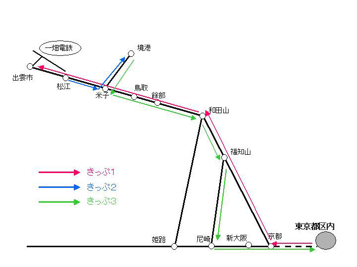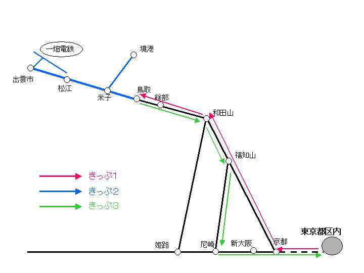 なるべく長い片道きっぷをつくるとどうなるか。東京-京都-福知山-大阪-京都という片道きっぷにして、福知山-出雲市、松江-福知山、米子-境港×2、京都-東京を買う方法だ。しかしこれは最長距離の切符が3.よりも短くなるので安くならない。はまかぜの運賃特例の趣旨に反して、分割購入したきっぷで"乗り通し"特典を受けようというのもどうかと思うので、机上の遊びにとどめておく。