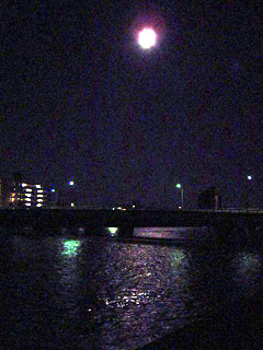 30分ほど歩いて橋に着く。整備された道だから街灯もあり、漆黒の闇というほどではない。橋を渡り、川沿いに歩いて、少し離れて橋の風景を眺める。丸い月が川面を照らし、橋を黒く浮かび上がらせている。片側2車線、コンクリート製のがっしりとした橋だ。
