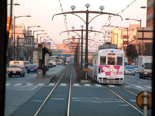 大通りを行く路面電車は堂々としたものだ。道幅が広いと都市は豊かにみえる。高層建築が少ないので空が大きく、気持ちがいい。国道1号線を東八町まで走り、そこからやや道が細くなる。電停もホームがなくなり、路面に描かれた指定場所に停車する。