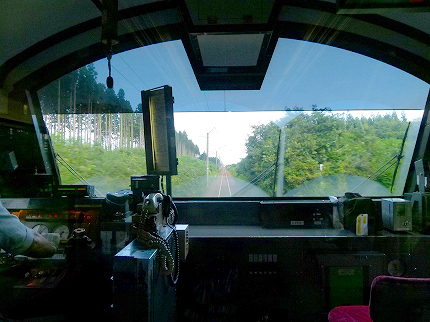 そんな米どころの景色を見ながら飯を食う。ありがたいことである。そして旨い飯はすぐに食べ終わってしまう。私は車内の探検に出かけた。先頭車は運転席の後ろが展望スペースとなっている。先客がひとりいて、その隣に座って前方を眺めた。列車は水田から丘にさしかかるところで、防風林と林の間をすり抜けていく。運転士さんの表情は見えないけれど、こんな景色を運転するなら気分もいいだろう。