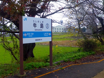 牛島駅で普通列車と交換する。徳島と穴吹の間は上下それぞれ30分間隔で列車が走る。つまり約15分ごとにすれ違う計算だ。1時間も走れば4回すれ違う。計算通りである。牛島の駅名標の向こうに見えた煙突のてっぺんに、大きな球がついている。これは知りたい。スマホの地図を調べると、建物はあるけれど名称がない。さらに調べてみたら森永乳業の工場だった。牛島だけに牛乳か。すでに閉鎖されているらしい。