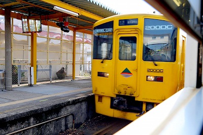 指宿駅から枕崎駅へ。白い車体に青い帯色を巻いた気動車だ。この塗色は関東では小田急や東武の電車の色だった。いまはどちらも銀色の金属色になってしまって寒々しい。この気動車もかなり高齢だ。引退後はどうなるのかと思っていたら、上り列車として黄色い気動車がやってきた。快速列車“なのはな”に使われる新型車だ。同じ車両を肥薩線でも見かけたけれど、あちらは赤、こちらは黄色である。そういえば唐津線の気動車も黄色、ただし長崎本線は青だった。JR九州は、観光列車だけではなく普通列車も楽しい。都会の銀色の電車より色彩が鮮やかだ。