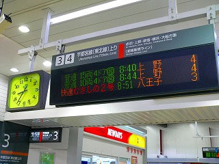 午前08時30分。通勤時間もそろそろ終りという頃だ。大宮駅の跨線橋では、列車が到着するたびに人の群れがうごめく。私は08時51分発の八王子行き快速列車、むさしの2号に乗ろうとしている。しかし、どのホームから発車するか判らない。あと10分もすれば発車案内板に表示されるだろうと考えて、腹ごしらえのために立ち食い蕎麦屋に入った。店内は忙しく空腹を満たす人で賑わっていた。