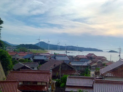 黒松海水浴場から浅利海岸にかけての海。雲の間から光が差し込み、水面を光らせている。その向こうに岬があり、手前に風力発電の風車が立っている。江津東ウィンドファームといって、2009年に11基が建てられた。設置会社は関西電力ではなく、江津ウィンドパワーという。風車の羽は40メートル。1基で1時間あたり2,000KWを発電する。昭和の匂いの列車に乗って、新しい時代の景色を見ている。