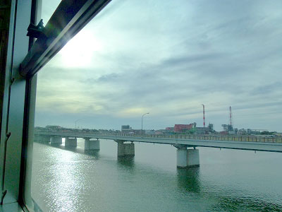 リアス式地形が終わり、列車は海沿いの平地を行く。建物も多い。ふと車窓に奇妙な形の白い物体。伝説のネッシーの尻尾のようだ。思わず写真に収める。カメラのモニターで拡大したら、尻尾の先からワイヤーがいくつも出ていた。なるほど、あれは橋だ。吊り橋である。