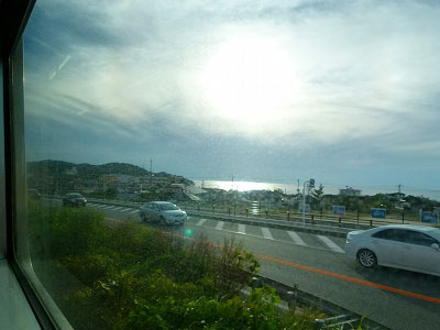 海沿いに国道。そして民家が続いている。陽が傾きつつあり、海の輝きが増したようだ。やがて列車は海から離れ、建物が増えていく。唐突に東京で見かけるような高層マンションが現れてびっくりする。携帯端末の地図を見ると、市営住宅とある。見晴らしがよさそうだ。