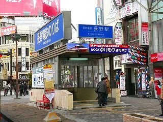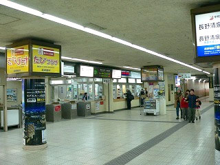 堂々たる橋上駅に生まれ変わったJR長野駅に対して、長野電鉄の長野駅はひっそりと地下にある。寒い土地柄だし、雨や風を凌げるので地下駅は好都合だが、白色蛍光灯がちらつくコンコースは寂しげだ。窓口で2,260円のフリー乗車券と100円の特急券を買った。次の湯田中行きの特急は50分後である。どうしたものかと思いあぐねていたところ、鰹だしの香りが漂ってきた。地下道の出口に立ち食い蕎麦屋で山菜蕎麦を食べる。オフィス街の休日である。他に客はいない。