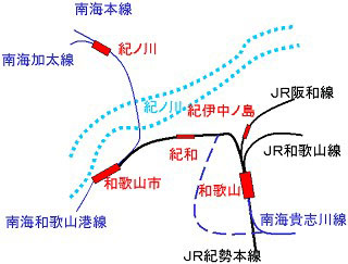 1922(大正11)年に開通した国鉄紀勢本線は、貴志川線との平面交差を嫌った。そのため貴志川線は市内の路線を放棄し、その代わりに現在の和歌山駅への乗り入れを許された。時が移り、阪和電鉄は1940(昭和15)年に南海電鉄と合併、しかし1944(昭和19)年には戦時体制のため国有化される。当時、貴志川線の経営は和歌山電気軌道が担っていたが、1961(昭和36)年に南海に買収された。和歌山は南海と国鉄と地方私鉄が入り乱れる複雑な鉄道史を持っている。