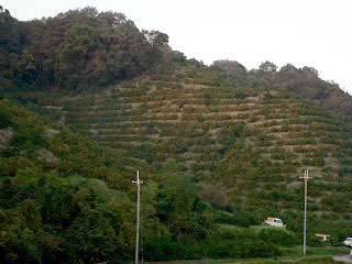 車窓に低く茂った木が整然と並び始めた。畑のように並んでいるが、家の垣根や道ばたにも生えていて、オレンジ色の丸い実を付けている。ミカンだ。そうだ、和歌山の名産品といえばミカンではないか、と車窓を見て気づく。やがてミカンの木の整列は山肌にまで広がった。山肌のミカンは夕陽に照らされて光る。美しい風景だ。