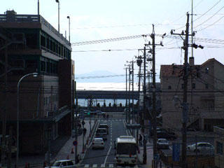 赤い電車はライバルと並んだ線路を走り、新しい高架区間に入って終点の蒲郡に着く。せっかく高い位置に駅を作ったけれど海は見えない。低い雑居ビルが建ち並んで水面を隠している。ホームを端から端まで歩いて、バス通りが作った建物の谷間から、四角く切り取られた海が見えた。