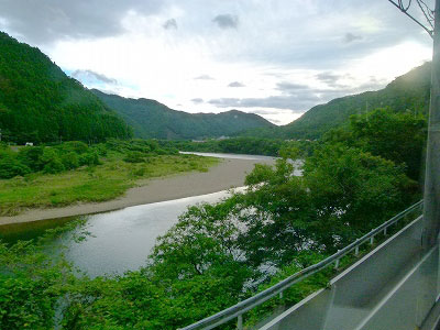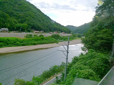 粕淵を出ると列車は東へ、そして南へ転進する。粕淵駅に寄るために、川沿いに大きく迂回している。鉄橋を境に江の川は車窓左側にかわり、私も左側のボックスシートに移った。川の手前の道は国道375号線。大田市と三次を直接結ぶ道路である。三江線と375号線は浜原まで並んでいる。ただし375号線は交通量の多い道なのだろう。浜原の街を迂回すべく、山側にトンネルでバイパスが作られている。
