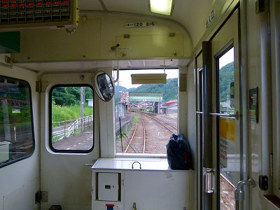 一番列車、三次行きの乗客は10名ほど。キハ120のボックスシートにひとりかふたり。高校生の6名はロングシートに向かい合い、ときどき談笑している。今は夏休み。ふだんなら通学列車として賑わう……と思いたい。