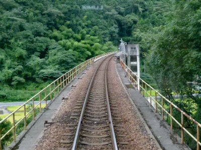 ダムの主要施設はここにはないので、付近の民家からの通勤通学客だろうか。レジャー客もダムの職員も車を使うのだろう。県立自然公園となっているダム湖を見られるかと思ったら、線路は左へ離れてトンネルに入った。やっとスピードが上がる。38年後の技術で敷設された高規格な線路である。この線路は江の川の支流に沿って小さな集落へ向かい、沢谷駅に停車。こんどは長いトンネルを通りぬけて浜原ダムに合流する。