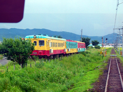 帰りの電車で確認したいことがあった。田舎館駅の先にある3両のディーゼルカーだ。携帯端末で調べたところ、かつて弘南鉄道黒石線で運用されたディーゼルカーだという。1両は国鉄時代に譲り受けたキハ22形。2両は秋田の小坂製錬から譲り受けた2100形。私が乗ったとしたらキハ22のほうだ。しかし、2100形は小坂製錬時代に乗ったかもしれない。縁が有りそうでなさそうで。しかし、いまや赤・青・黄に塗られ、幼児玩具のような姿である。どれがどれだかわからない。