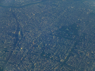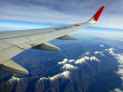 数少ない右側席を選んだけれど、残念ながら富士山は見えない。飛行機は富士山の真上を飛んだ。アナウンスによると左側の窓から火口を望めたようだ。満員の機内では移動して眺めるわけにもいかなかった。飛行機のルート決定はどんな法則だろう。空に線路があるわけではないから、目的地に向かって最短距離になるとまでは想像できる。