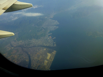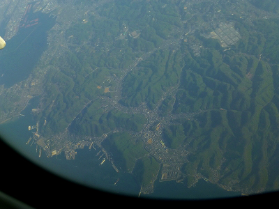 富士山は見えなかったけれど、右側の景色も良かった。富士山の北側を見るから、富士五湖がよく見える。赤石山脈と木曽山脈の尾根に雪が残り、夏の到来を告げていた。平野に出て名古屋上空、真下に小牧空港が見える。そして広大な琵琶湖を望み、中国山地の南を飛ぶ。広島の扇状地、岩国空港が見えた。昨年(2012年)末から民間機の使用が始まった。降りてみたい空港だ。