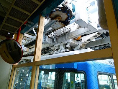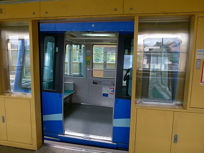 ホームに上がるとゴンドラが待機している。ホーム側の窓に雨滴が付いている。反対側は濡れていない。高架レールが傘のように雨を遮っているのだろう。室内は椅子は八つ。広さは3畳くらいか。これで定員は25名とある。まさしく観光地のロープウェーのゴンドラだ。しかし新交通システムであり、無人運転である。鉄道というより、真横に動くエレベーターのような、静かで気楽な装置だ。自動放送が流れ、自動ドアが閉まると、ゴンドラがぐいっと加速した。事前に得た知識によれば、ゴンドラの上に車輪があり、それが懸垂式モノレールのごとく高架線路の上に乗っている。モノレールとは違って、車両に動力がない。線路上には一定の速度でワイヤーロープが流れており、車両はそのワイヤーロープをつかんで動く。