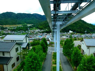 そんなハイテクな乗り物に、ぶたんはスーツ姿のビジネスマンや病院通いの年寄りや、通学の子どもたちが乗っている。この時間は私だけかと思ったら、発車間際に家族連れが乗り込んで椅子が埋まった。彼ら住民にとって、システムはどうでもいい問題である。しかし私は小型宇宙船気分で射出され、空中の移動を楽しんだ。車窓をカメラで撮っているけれど、同室の人々は気にしていないようだ。私のような見物客は珍しくないのだろう。