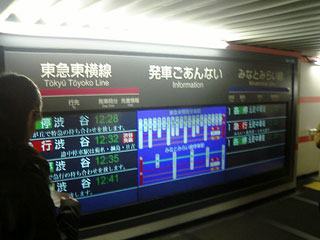 横浜駅はまだ改良工事中のようで、せっかく新線が開通したのに、地下自由通路からみなとみらい線への通路は狭い。人の流れに合わせて早足で改札に向かうと、壁一面の大きな行き先案内板に驚いた。コンコースも白が基調で明るく、きらびやかだ。ローカル線の旅が続いたせいか、なにもかも豪華に見える。